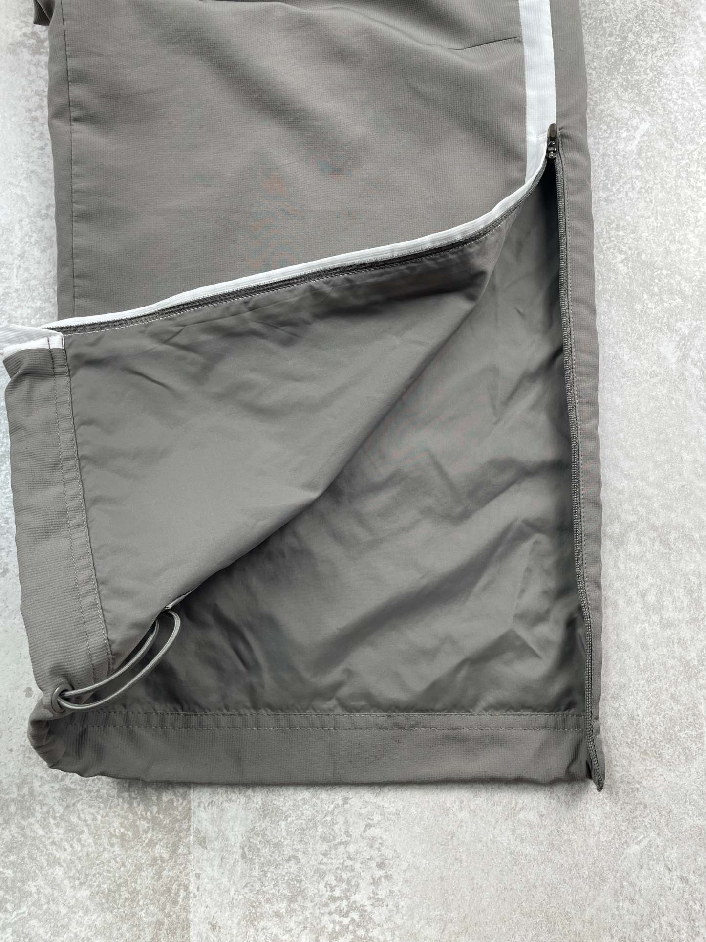 - Zippers at leg openings