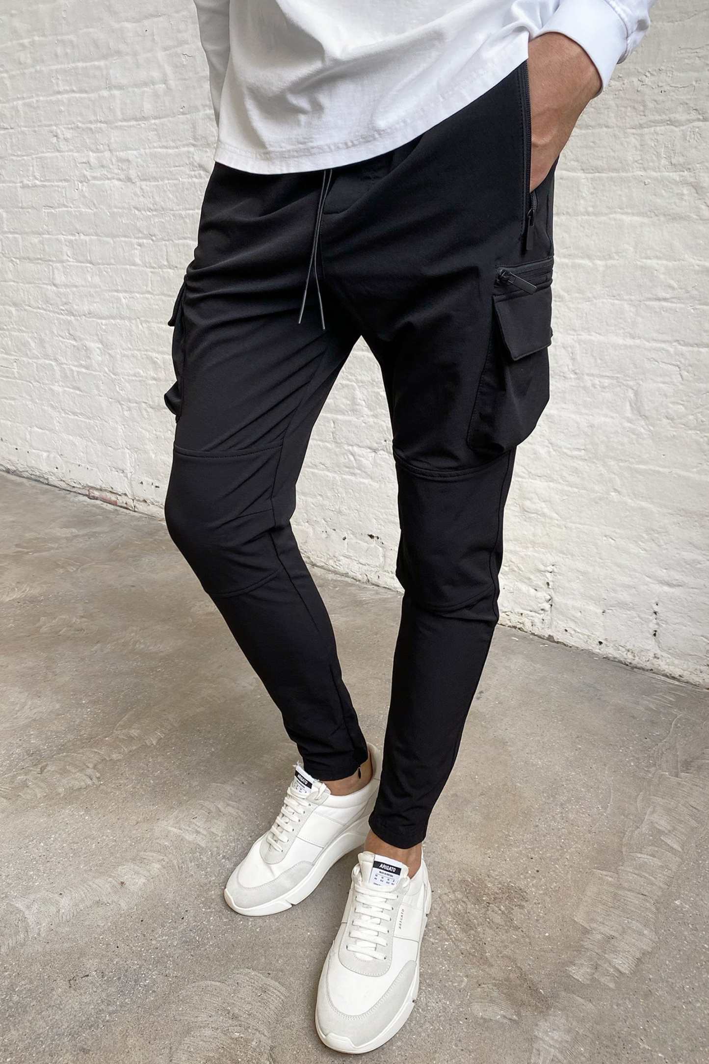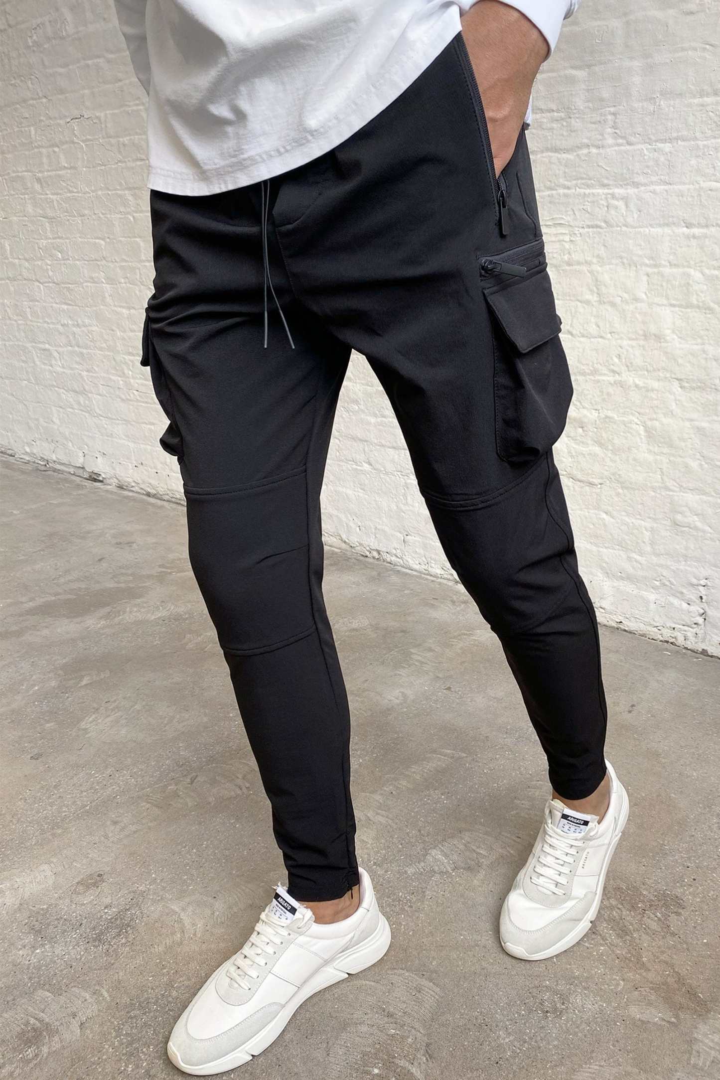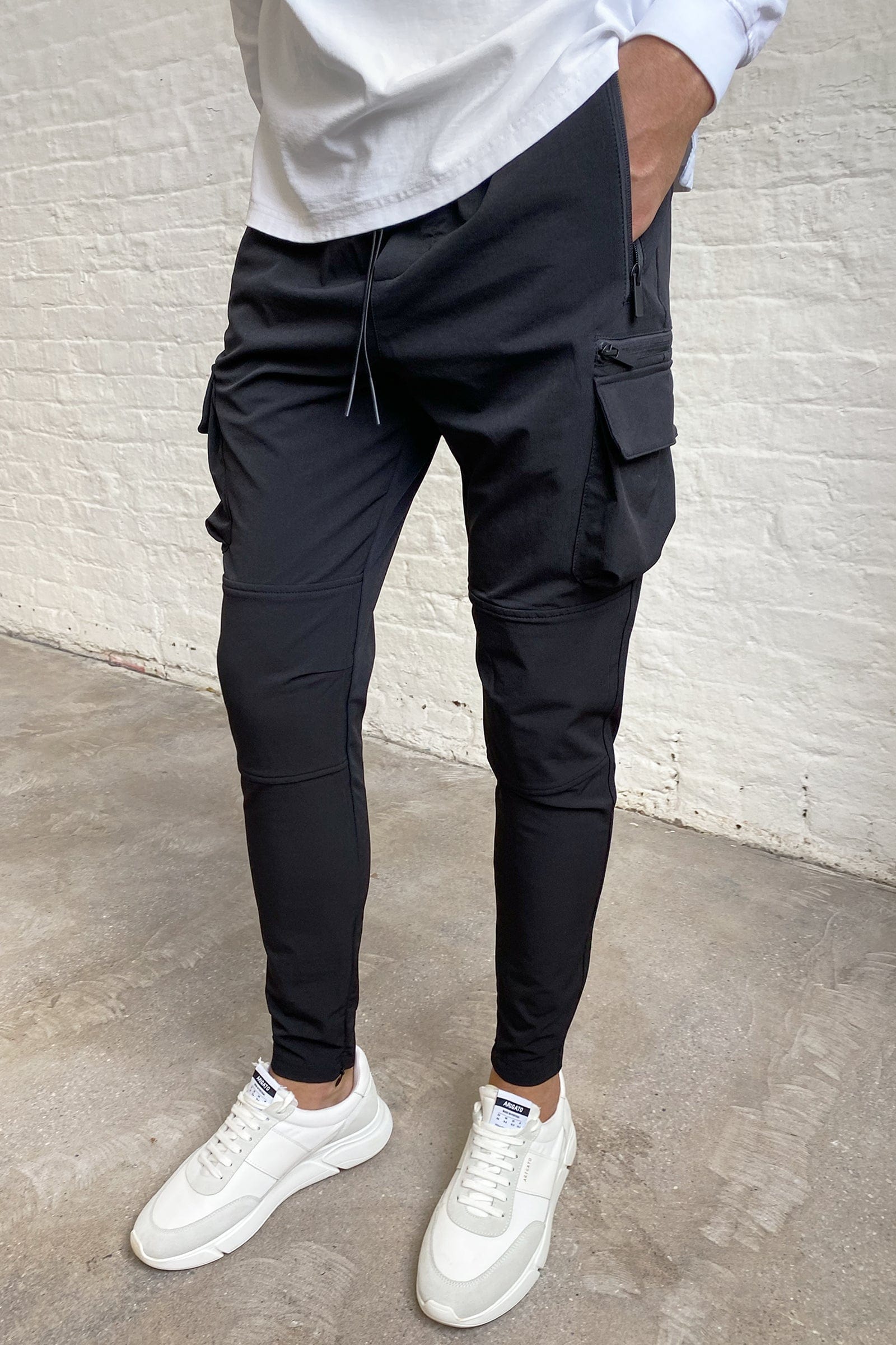 Crafted from resilient 4-way stretch mid-weight nylon, these pants feature a slim taper to the concealed zip opening, cargo pockets on the outer legs, a single zip pocket, branded matching metal hardware, and finished with silicon-dipped dyed-to-match draw cords.
