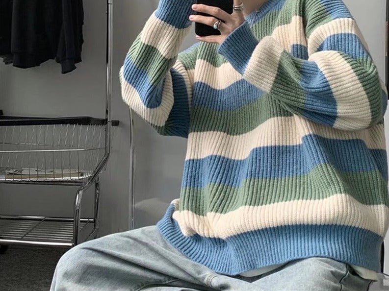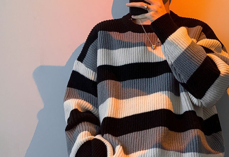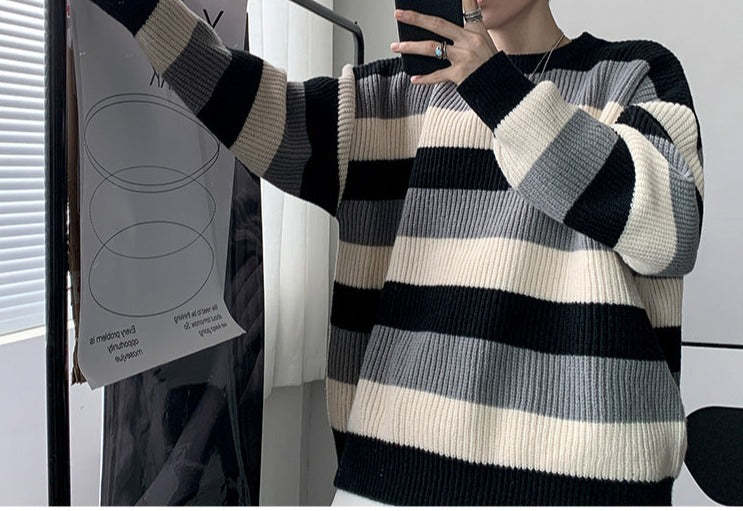 Thick Striped Sweater Men's Loose Round Neck Sweater